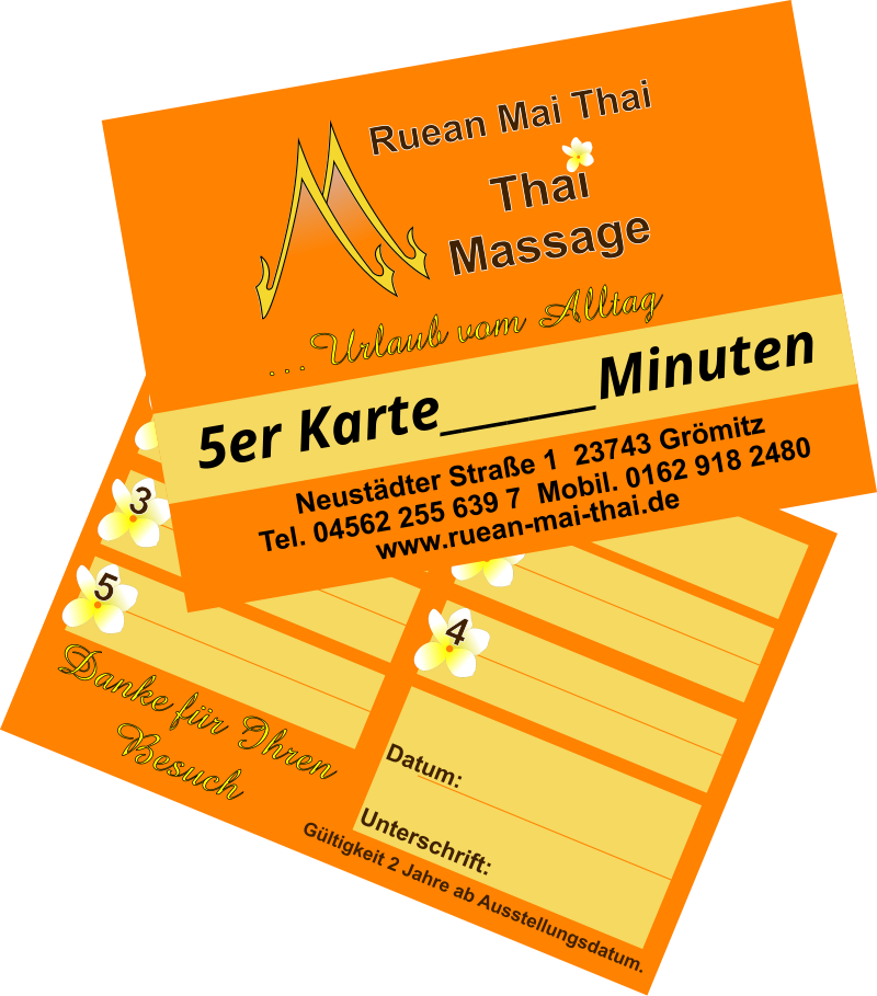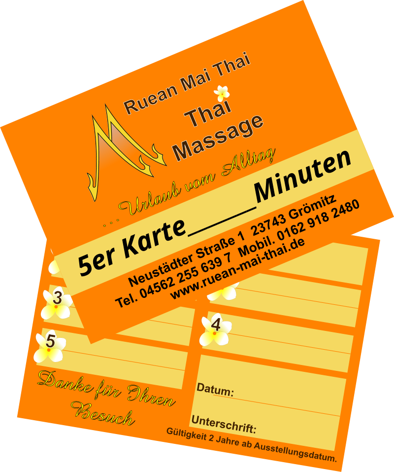 Terminvergabe nur  Telefonisch. Terminvergabe nur  Telefonisch. 1.	Kopf-Nacken-Schulter-Rücken-Massage 30	Minuten    38,- € 5er Karte a     30 Minuten 170,- € Paarmassage  30Minuten   72,- € 2.	Fuß-Massage 30	Minuten    38,- € 5er Karte a     30 Minuten 170,- € Paarmassage  30Minuten   72,- € 3.	Traditionelle Thai-Massage 60	Minuten    62,- € 90	Minuten    89,- € 5er Karte a     60 Minuten 285,- € 5er Karte a     90 Minuten 420,- € Paarmassage  60Minuten 120,- € Paarmassage  90Minuten 175,- € 4.	Aroma-Öl-Massage 60	Minuten    62,- € 90	Minuten    89,- € 5er Karte a     60 Minuten 285,- € 5er Karte a     90 Minuten 420,- € Paarmassage  60Minuten 120,- € Paarmassage  90Minuten 175,- €